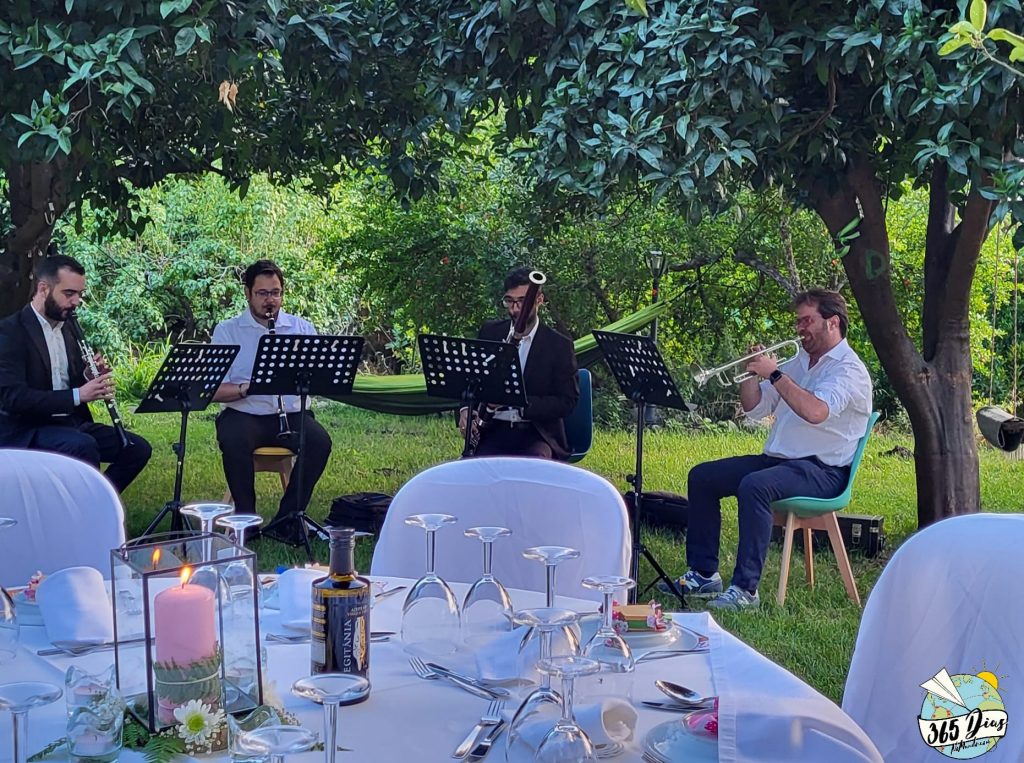 Ouvimos algumas explicações sobre a origem da capela, a sua arquitetura, e seguimos para o jantar. Apesar de parecer que a estrada acaba na capela, ela continua até à Quinta de S. Pedro de Vir-a-Corça, onde as senhoras, Maria incluída, receberam uma coroa de flores. Alguns momentos de música ao vivo e o jantar começou com umas empanadas de beldroegas e queijo de cabra e morcela em ramos de alecrim. Depois passámos para a mesa, onde nos esperavam uns mini adufes. Na Beira Baixa os queijos são especiais e estes chamavam por nós. O rei do jantar foi o borrego merino da região assado em forno de lenha com legumes. Tudo terminou com papas de carolo com frutos silvestres (mirtilos) e amêndoas laminadas. A Maria adora mirtilos, devorou-os e nós só tivemos direito às papas. Conversámos bastante sobre o que conhecemos na região e é maravilhoso quando pessoas que gostam de viagens partilham diferentes experiências e apresentam recantos que muitos desconhecem.